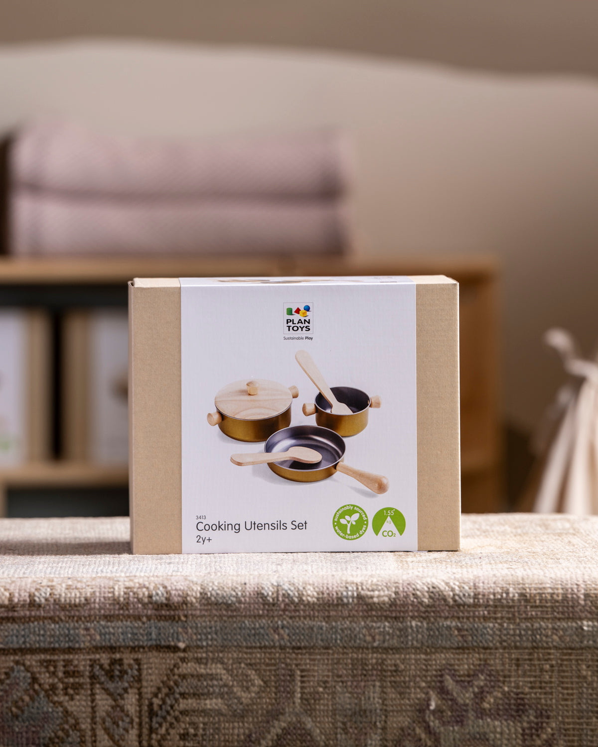 The set includes frying pan, pot with lid, saucepan, spatula, and turner.