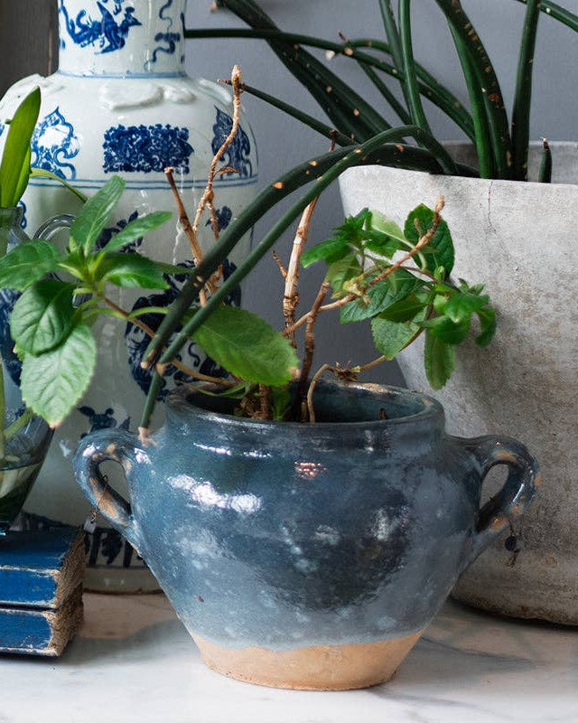 Charming vintage garden pot sourced from Europe with beautiful blue, green, and golden tones. Each piece is unique with natural wear that adds character. Perfect as a decorative planter or standalone shelf accent. Display alone or group several together for maximum impact. Note: vintage condition with variations in color, size, and distressing.