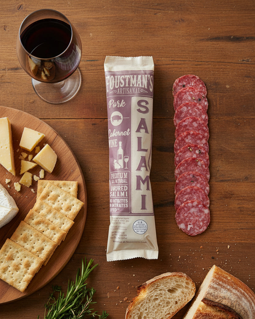 Foustman's All-Natural Uncured Salami gets a sophisticated twist with the addition of quality cabernet wine. This naturally dry-cured pork salami delivers rich, complex flavors perfect for charcuterie boards, cheese platters, or solo snacking. Pair it with cheese, crackers, olives, and wine—or slice it into eggs, pasta, and salads for added depth. Shelf-stable for up to 10 months, it's ideal for entertaining, camping, or travel. No nitrites or nitrates added, gluten-free, and dairy-free. Remove the plant-based fibrous casing before eating. Refrigerate after opening. 8oz package.