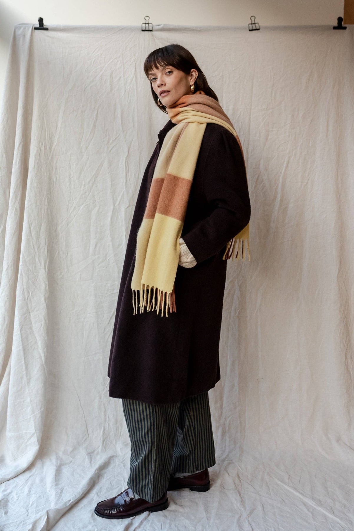 Merging timeless patterns with modern colours is what we do best. Elevate your outfit with this fringed check TBCo scarf that features buttermilk yellow and rust orange in a classic block pattern. It's woven from soft and thermo-regulating lambswool for optimised comfort and warmth.