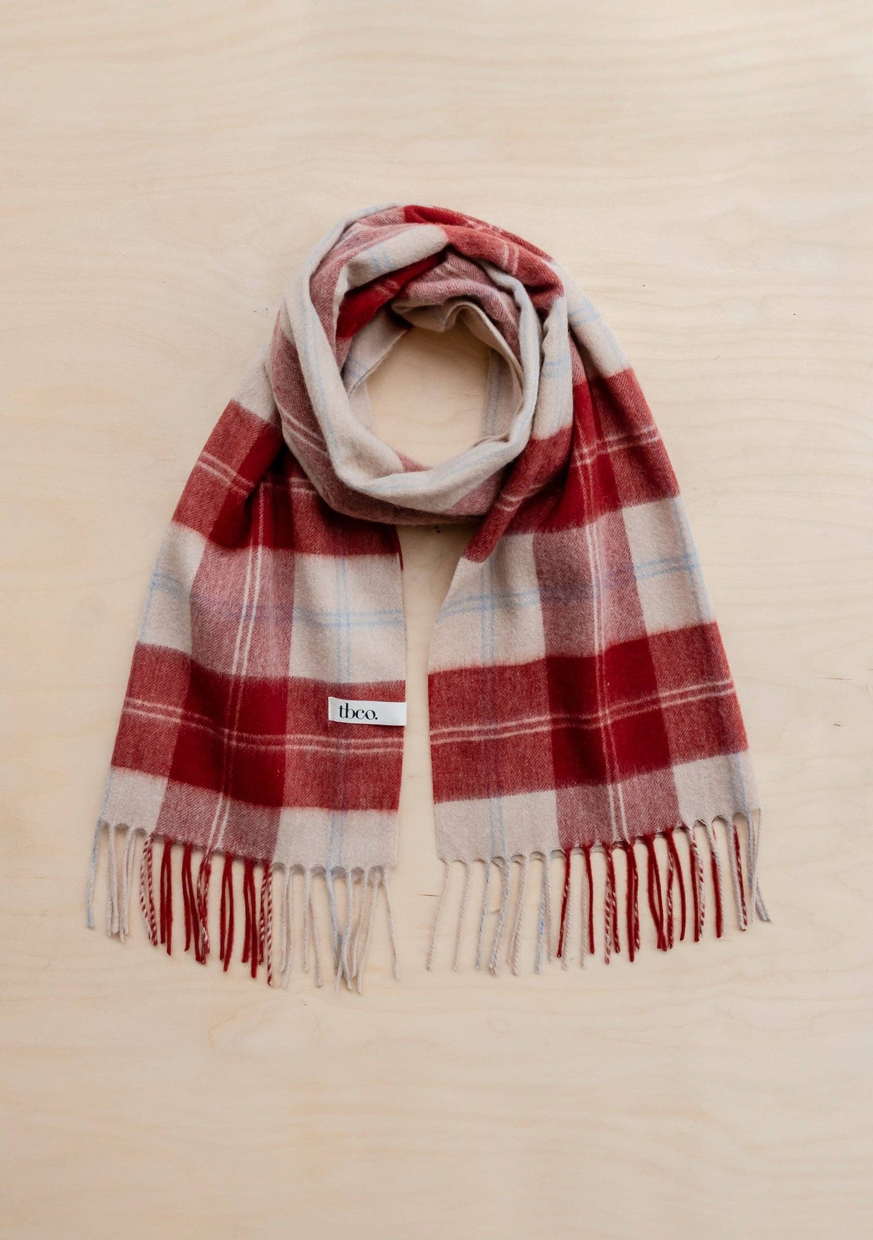 Merging timeless patterns with modern colours is what we do best. Elevate your outfit with this fringed check TBCo scarf that features deep red, soft cream, and a hint of baby blue. It's woven from soft and thermo-regulating lambswool for optimised comfort and warmth.